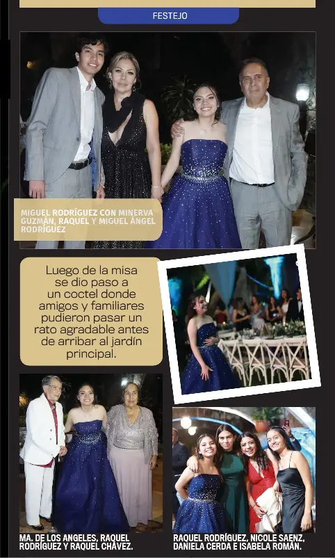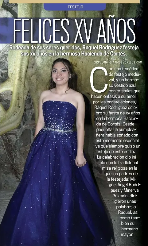 Con una temática de festejo medieval, y un hermoso vestido azul con cristales que hacen énfasis a su amor por las constelaciones, Raquel Rodríguez celebró su fiesta de xv años en la hermosa Hacienda de Cortés. Desde pequeña, la cumpleañera había soñado con este momento especial ya que siempre quiso un festejo de este estilo. La celebración dio inicio con la tradicional misa religiosa en la que los padres de la festejada: Miguel Ángel Rodríguez y Minerva Guzmán, dirigieron unas palabras a Raquel, así como también su hermano mayor.